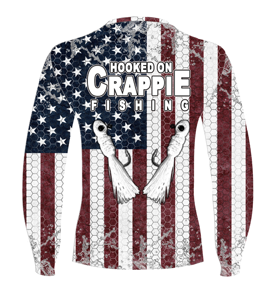 SUBLIMATION LS SUPREME COMFORT 4-WAY STRETCH PERFORMANCE TEE USA FLAG HOOKED ON CRAPPIE